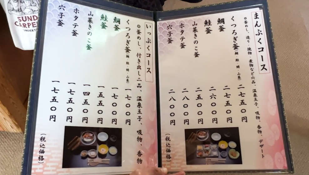 • いっぷくコース (선택한 가마솥밥에 쯔키다시 2종, 온센타마고, 일본식 짠지, 국이 함께 나오는 코스)