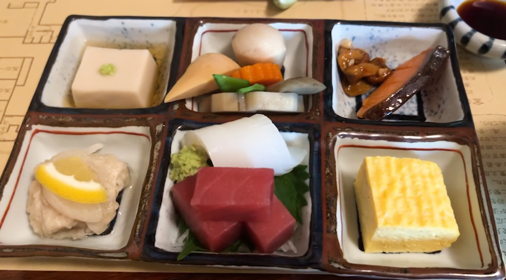 왼쪽 위부터 두부, 죽순 등 찐 야채들, 생선조림, 난방즈케(생선초무침), 사시미, 달걀말이인데 하나 하나가 정성이 들어간게 느껴져요.