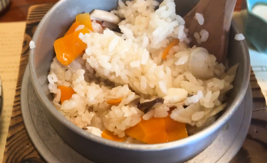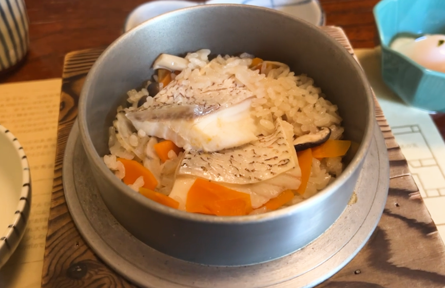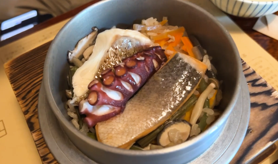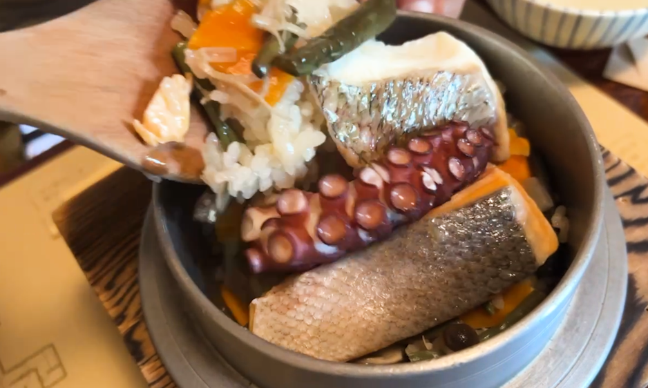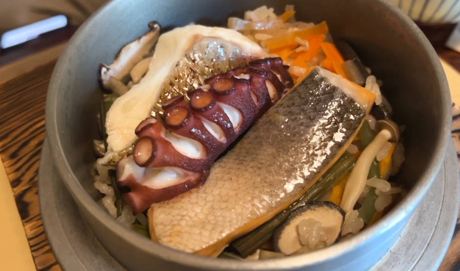 • くつろぎ釜(鯛・鮭・山菜・タコ)’쿠츠로키 가마’ (도미, 연어, 산채, 문어가 들어간 솥밥) 2750엔
