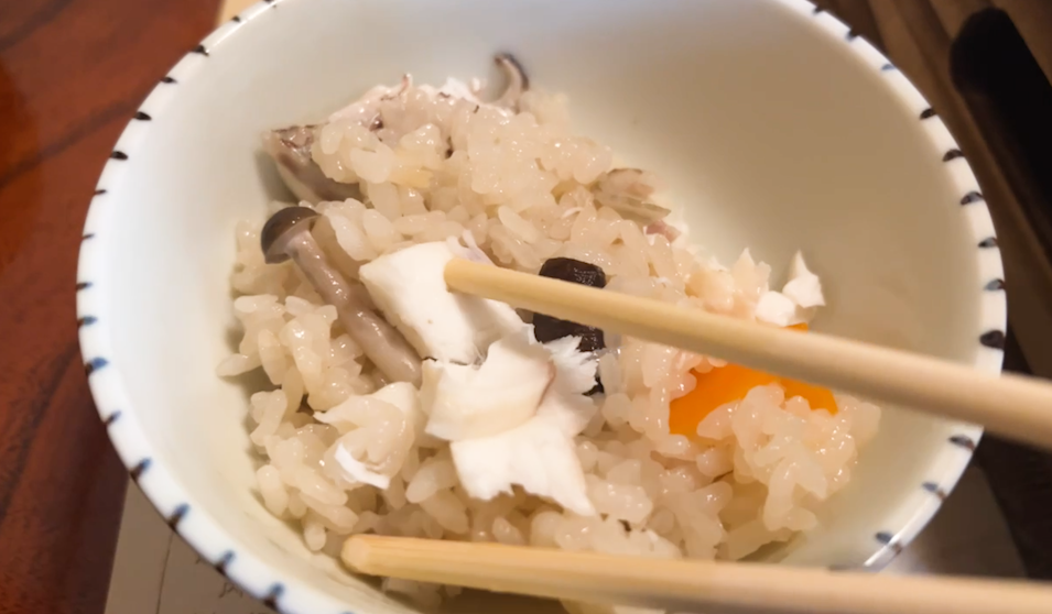짜잔~ 도미, 연어, 문어, 버섯, 산채가 들어간 쿠츠로기 솥밥이에요.