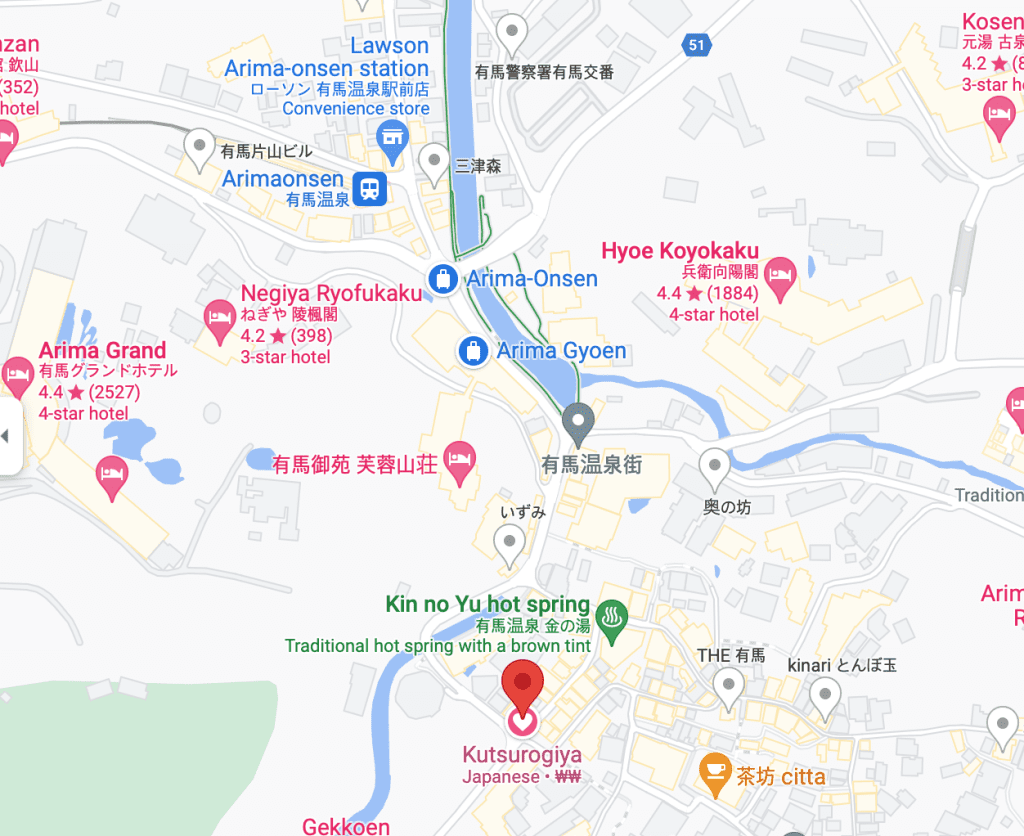 쿠츠로기야는 아리마온센(有馬温泉)역에서 도보 5분거리에 있고 쉽게 찾아갈 수 있어요.